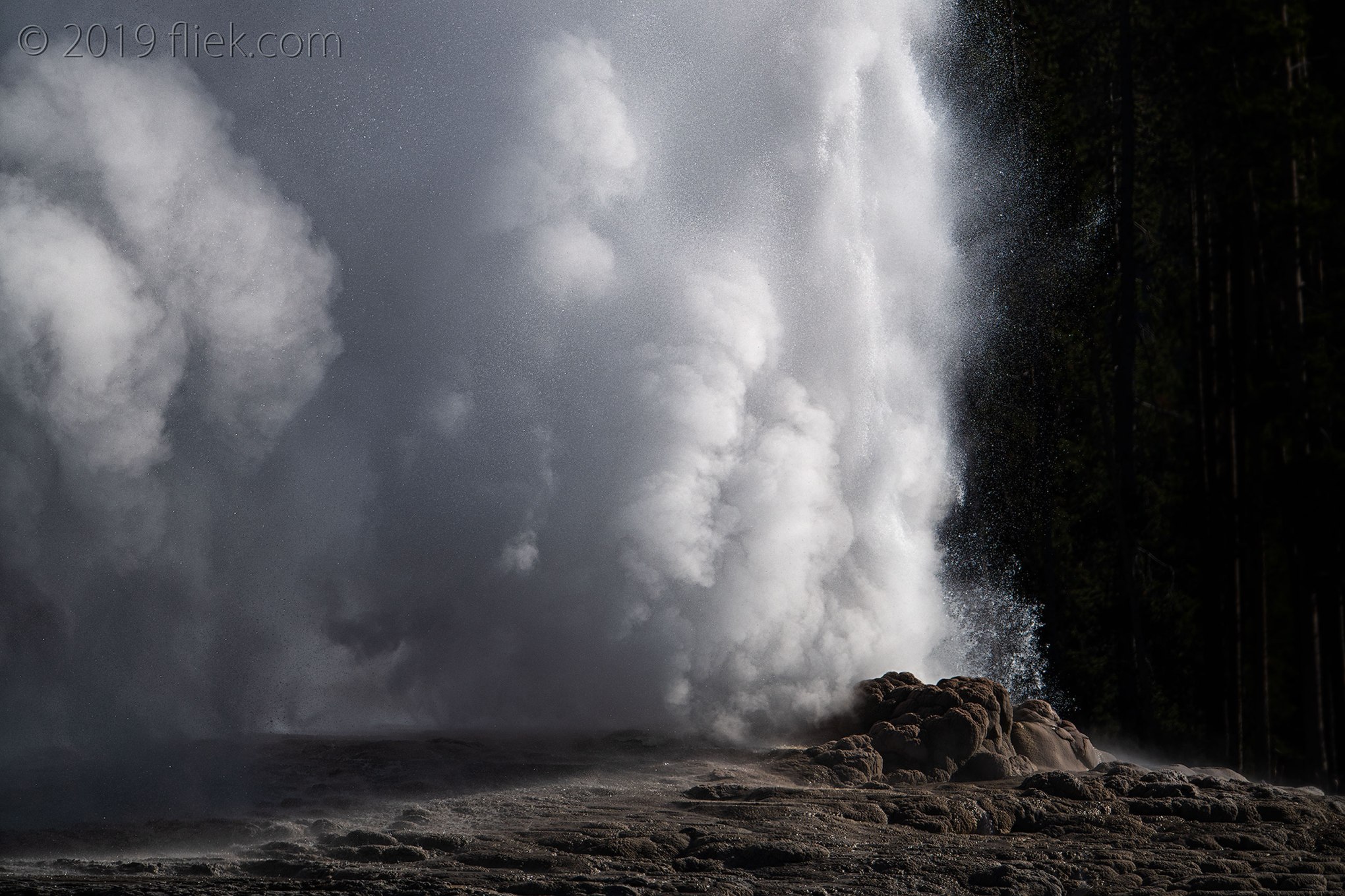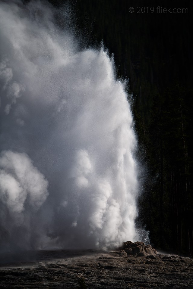 You can’t really direct Old Faithful in any way nor can you expect the perfect eruption (unless you perhaps have a couple of decades to spend). I guess it was just luck to be at that spot at that time of that day, and with a lens I would normally not even have taken with me. Out of the few bursts I shot one interesting image had come out, much to my surprise.