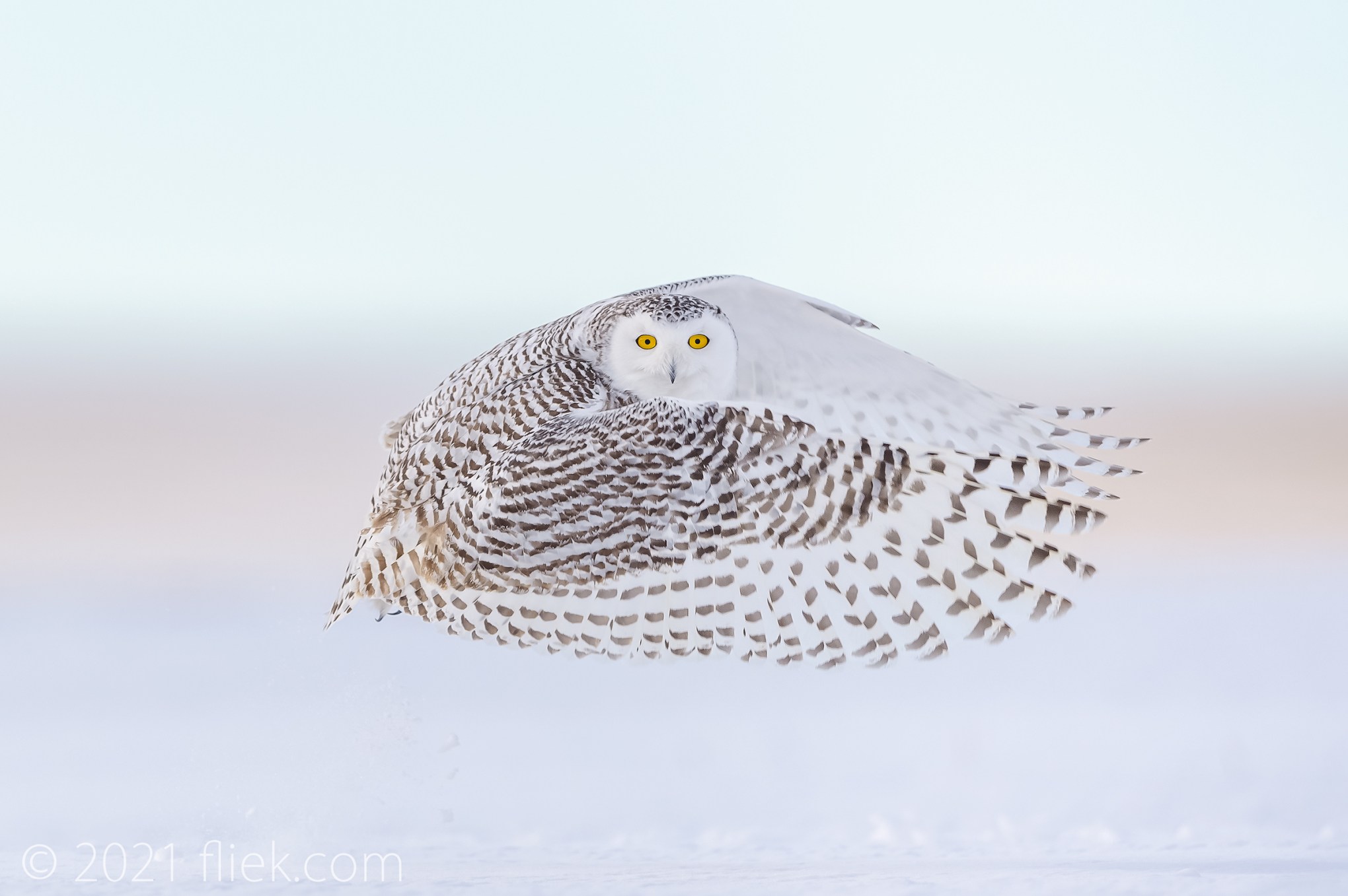 After a Snowy Owl has raised its wings and jumps up for take-off, it pushes them again downward for the initial lift. What’s remarkable about these birds is that they never leave sight of their prey during the whole process of take-off until the end of their flight. They are supported by their ability to turn their heads by up to 270 degrees, which is not only useful but also quite needed as they cannot rotate their eyes. These are firmly stuck in their eye sockets; in fact owls do not even have eye balls as such!
